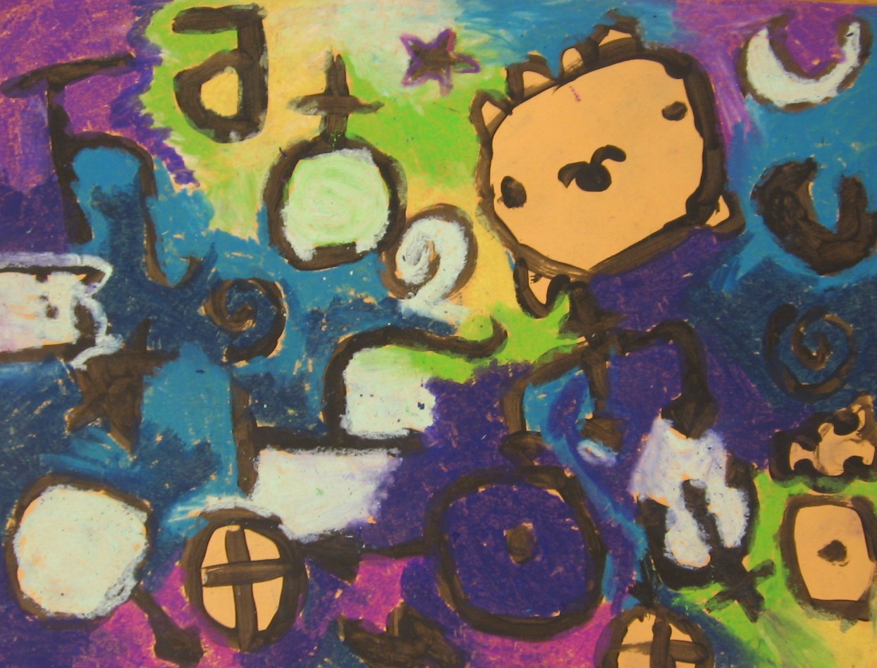On day one, we viewed a PowerPoint I created about Paul Klee and looked at several of his works that involve symbols. Then we took some time to discuss what things in our own lives could be symbols. I shared a handout with the students of symbols for the solar system. I simply asked them to create at least six symbols on their own paper. Most students did more than six--no problem. These could from the handout or their own creation! To get a variety of sizes, I asked them to paint two small, two medium and two large. I also encouraged them to turn the paper as they worked. As I demonstrated, we talked at length about the importance of symbols in our lives.